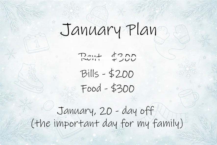 Hi. I've been thinking. Let me write a plan for each month. You'll appreciate it, and I'll structure it based on what I need. January plan update. I have 200/400 left for bills and 300/500 for food. Thank you for your your care! However, if you'd like to invest in the super-goal, I'd like to send you a special thank you 🤍 P. S. Since it's the day off at 20th, I've decided I'll still come, but I won't be with you for too long.